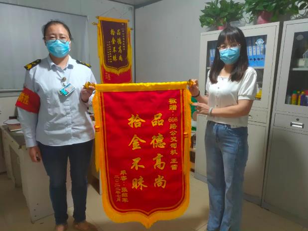 7月20日下午吳先生帶著一面“拾金不昧,品德高尚”的錦旗來到了新巴士公司38路調(diào)度室對駕駛員李倩倩表示感謝。