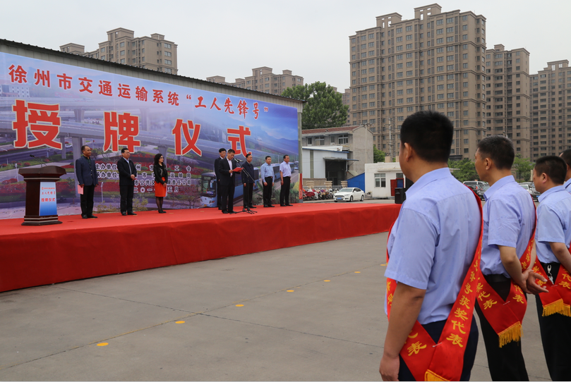 5月8日上午10點,徐州市總工會在郭莊路停保場隆重舉行徐州市交通運輸系統(tǒng)“工人先鋒號”授牌儀式。徐州市人大副主任、市總工會主席束志明,徐州市副市長趙立群,市文明辦主任沈麗,市交通運輸局局長蔡前鋒,市總工會副主席劉洪印、副主席潘華,市交通運輸局工會主席王培河以及公司董事長、總經(jīng)理杜紅軍等領(lǐng)導出席了授牌儀式。來自公交公司、汽車客運總站等交通運輸行業(yè)的300余名員工參加了授牌大會。