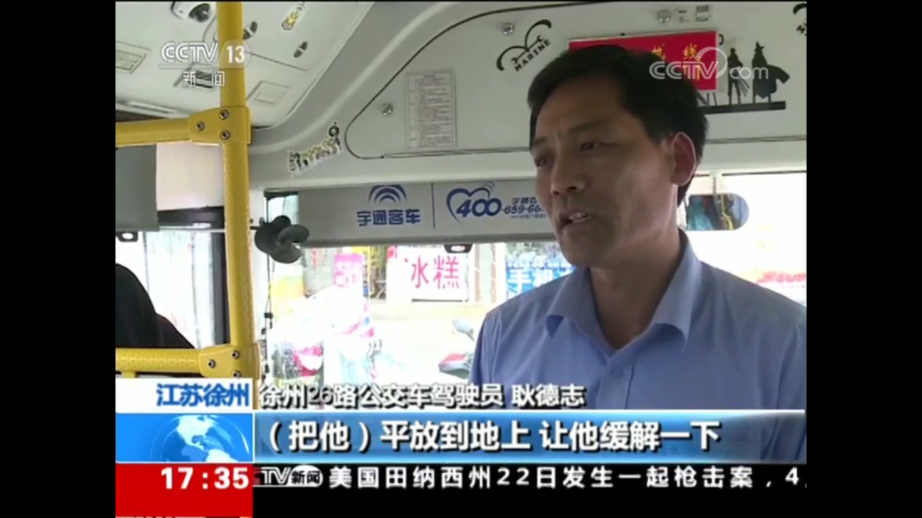 耿德志和昝昱安一邊招呼乘客前來幫忙一邊撥打120。一名自稱是護(hù)士的女乘客說男乘客是癲癇病發(fā),在乘客的齊心幫助下讓男乘客平躺在車廂,把頭歪到一邊,并防止他咬到自己的舌頭。為爭分奪秒救治患病乘客,耿德志在征得車上乘客同意、請(qǐng)示過公司領(lǐng)導(dǎo)后,公交車緊急變身“120”,5分鐘就將車直接開到了距離最近的徐州礦務(wù)集團(tuán)第一醫(yī)院的急診室門口。耿德志在車上照顧發(fā)病乘客,昝昱安和熱心乘客一起跑到急診喊來醫(yī)護(hù)人員。看到醫(yī)護(hù)人員實(shí)施救治,并聯(lián)系到患病乘客的家人后,耿德志和昝昱安才放心地回到崗位上。