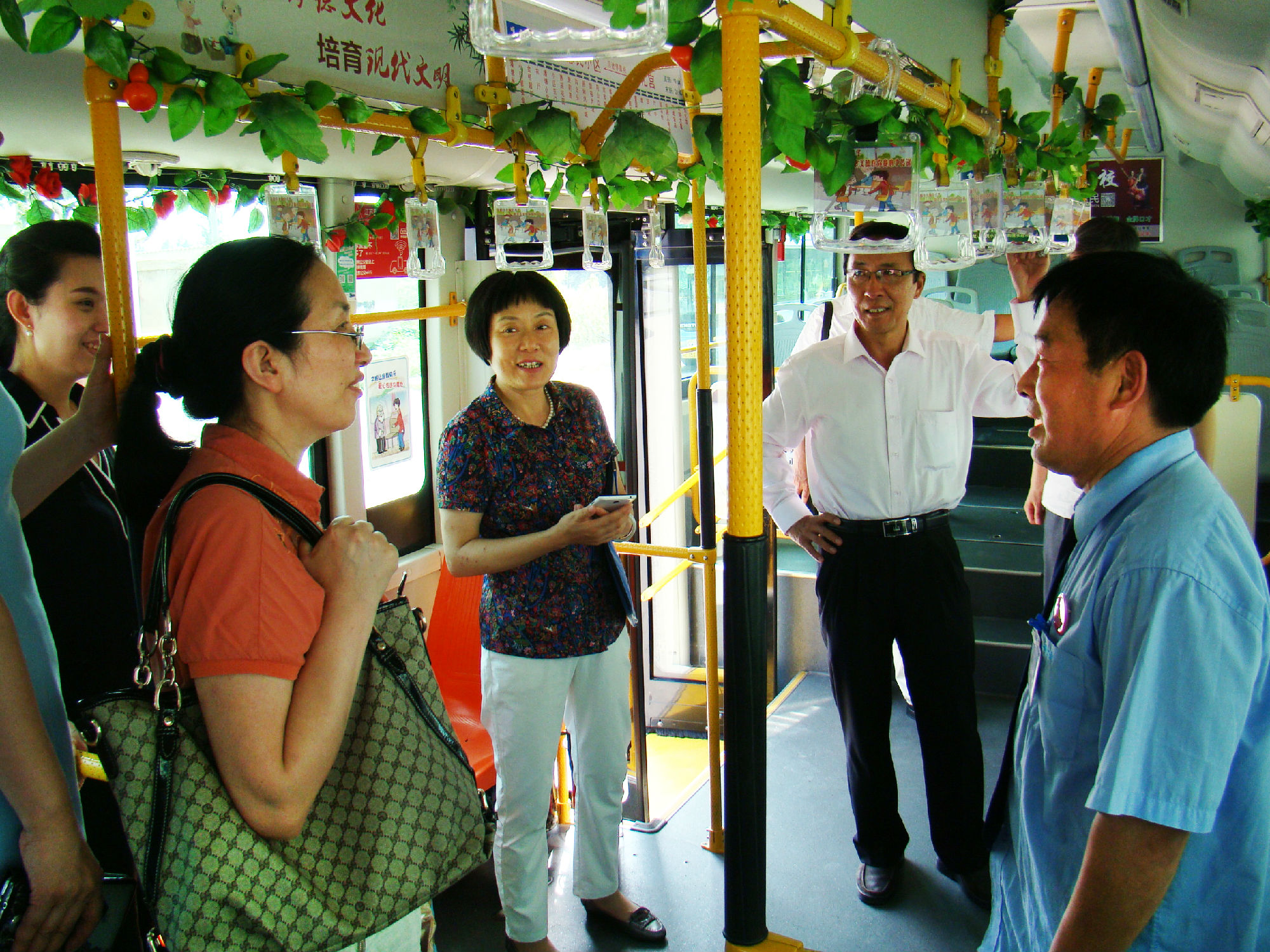 為有效提高老年人乘車安全系數(shù),公司為14路線在車廂內(nèi)設(shè)置“老幼病殘?jiān)小睈坌膶W幕A(chǔ)上,專門設(shè)置了“敬老專座”; 為了給老年乘客提供優(yōu)美的乘車環(huán)境,還在車廂的頂部和前部放置各種綠色植物和鮮花,同時(shí),在駕駛座后面安裝了便民袋,配備常用藥物、老花鏡、針線包、意見簿及公交乘車指南、報(bào)紙、老年人專用雨披等物,讓老年乘客登上公交車,就能感受到清新氣息。