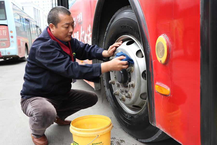 85路線經(jīng)過礦區(qū)路況差,一趟車下來車就很臟了,黨員祁保華把勞動(dòng)當(dāng)成一種樂趣,只要車輛停下來,他就會拿起刷子,把車身從前到后刷上一遍,再用抹布細(xì)細(xì)擦,輪胎更是一趟一擦,一天8個(gè)來回,他就要擦8遍輪胎。晚上在文化宮跑夜班,都晚上9點(diǎn)了,他還借著微弱的路燈,里里外外把車打掃干凈。在他的帶動(dòng)下,85路線駕駛員由觀望到比賽,都成了車輛保潔的好手。