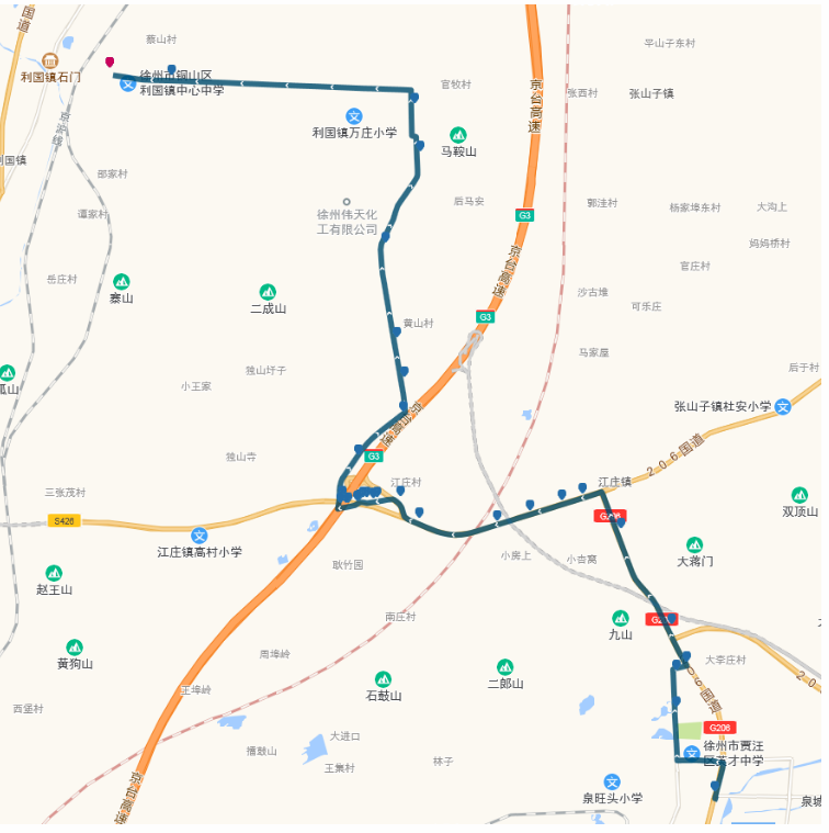 ??空军c(diǎn):賈汪客運(yùn)站,宏安路口,賈汪老站,大李莊,江莊南,江莊北,鐃鈸,龍山水泥廠,萬(wàn)莊,馬元,郝家,蔡山,利國(guó)。