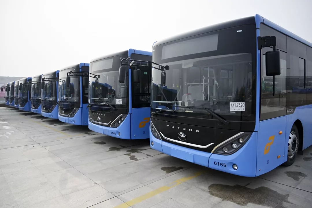 停放著首批到來(lái)的純電動(dòng)公交車(chē),